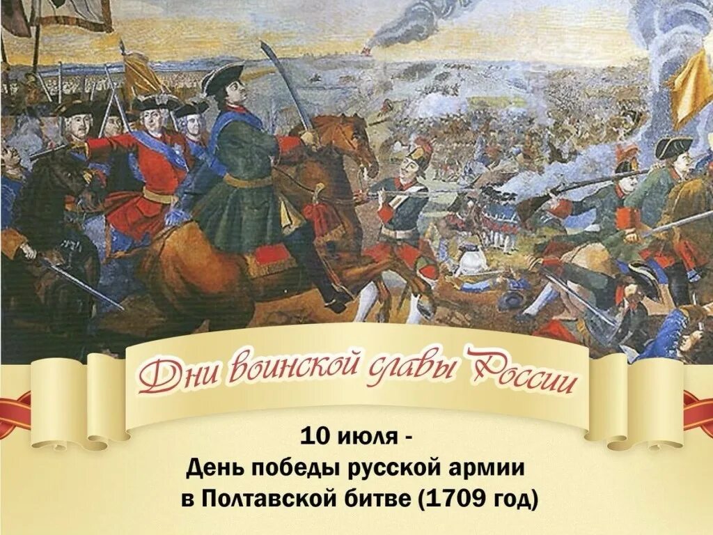 День воинской славы России – День победы русской армии под командованием Петра Первого над шведами в Полтавском сражении (1709 год) отмечается 10 июля в соответствии с Федеральным законом РФ от 13 марта 1995 года № 32-ФЗ «О днях воинской славы (победных днях) России».